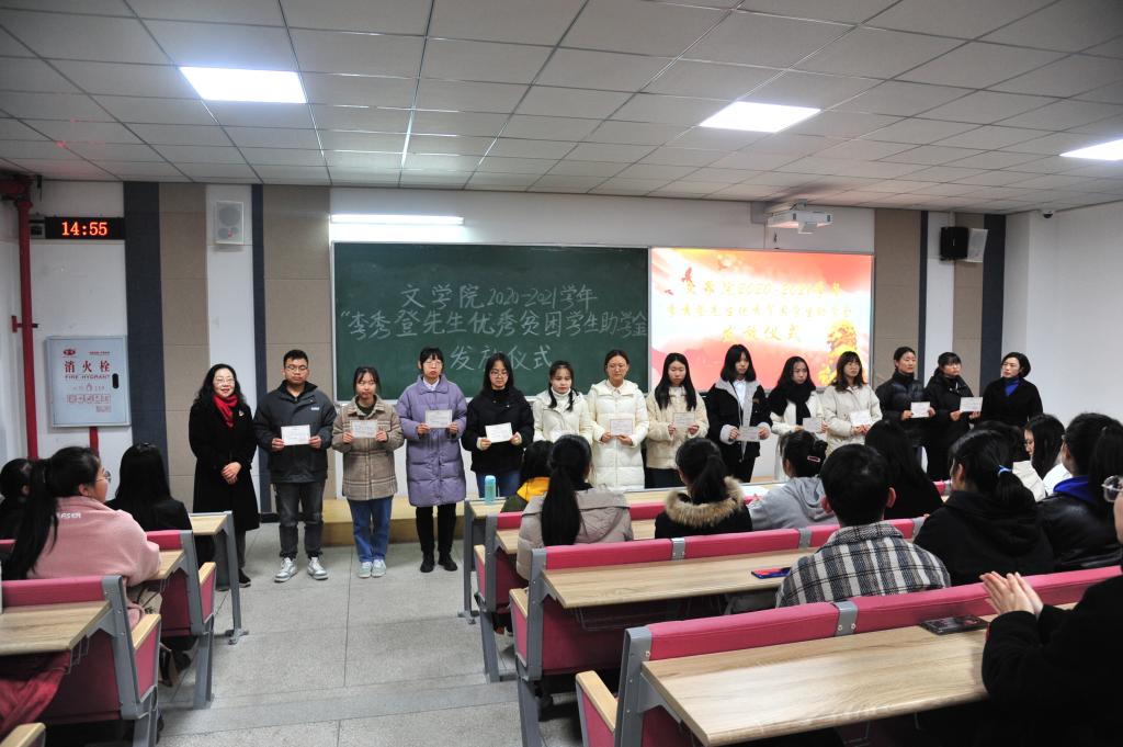 文学院党总支书记唐晓萍勉励学生们说:“在今天资助仪式发放之前,文学院举行了一堂党课,大家学习了李秀登老人的事迹,这是一场穿越时空和历史的党课,通过李秀登老人的事迹,让大家了解到了老一辈共产党人生命不息,奉献不止的革命精神,希望受到资助的同学们可以向李秀登老人学习,自立自强,传承大爱的精神,奉献社会,回报祖国”。