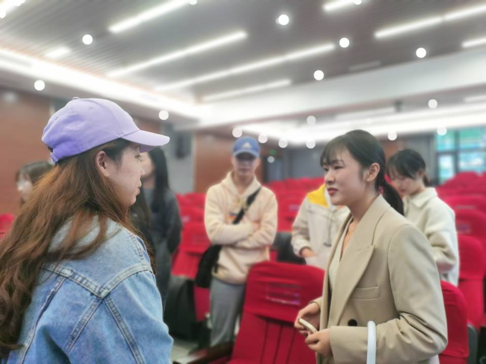 万州区高峰街道社保所、我校2019届毕业生佘佳林(右一)在与应届毕业生交流