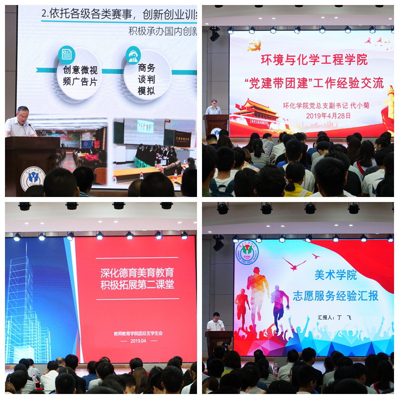 “榜样引领”环节,通报表彰了全校2018年度3个“五四红旗团总支”、2名“五四红旗团总支书记”、25个“五四红旗团支部”、419名“优秀共青团员”、408名“优秀共青团干部”等先进集体和个人;“仪式教育”环节,按照团中央关于团员发展的最新要求,本次符合条件的70名青年学生,在现场团旗映衬下庄严宣誓,光荣加入共青团组织;“青春畅聊”环节,相关校、院级团学组织代表从“党建带团建”“第二课堂德育美育”“学生会改革进行时”“学生社团管理”“青年学生创新创业”“绿色社会实践、志愿服务”等方面分享交流工作经验。