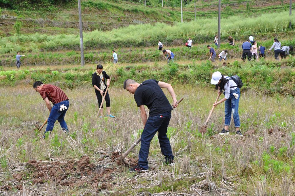 火热建功新时代,来到乡村献份爱。4月29日上午,天气晴好,微风和煦,学校教职工队伍一行拿着铁锹,扛起锄头浩浩汤汤向龙驹镇官坝村玫瑰香橙种植点进发。