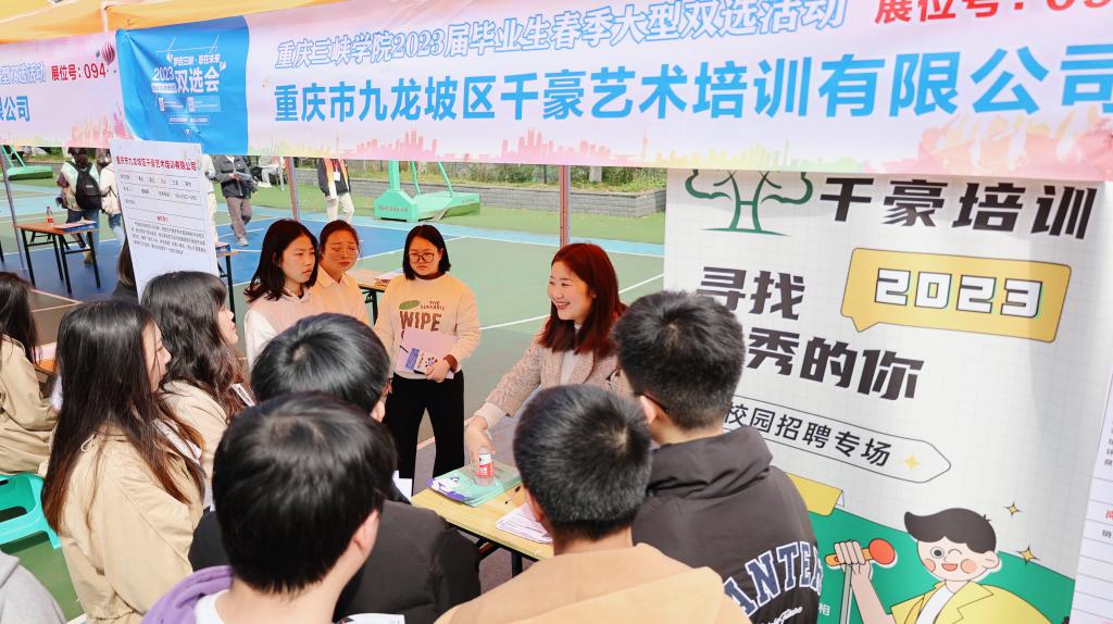 为更好服务广大用人单位和毕业生,搭建好“双向选择”供需平台,促进毕业生实现高质量就业,3月30日上午,重庆市2023届普通高校毕业生送岗位进高校双选活动(万州专场)在我校篮球场举行。