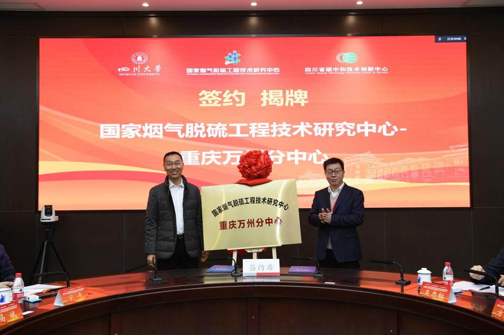 王建平与刘超为“国家烟气脱硫工程技术研究中心重庆万州分中心”揭牌