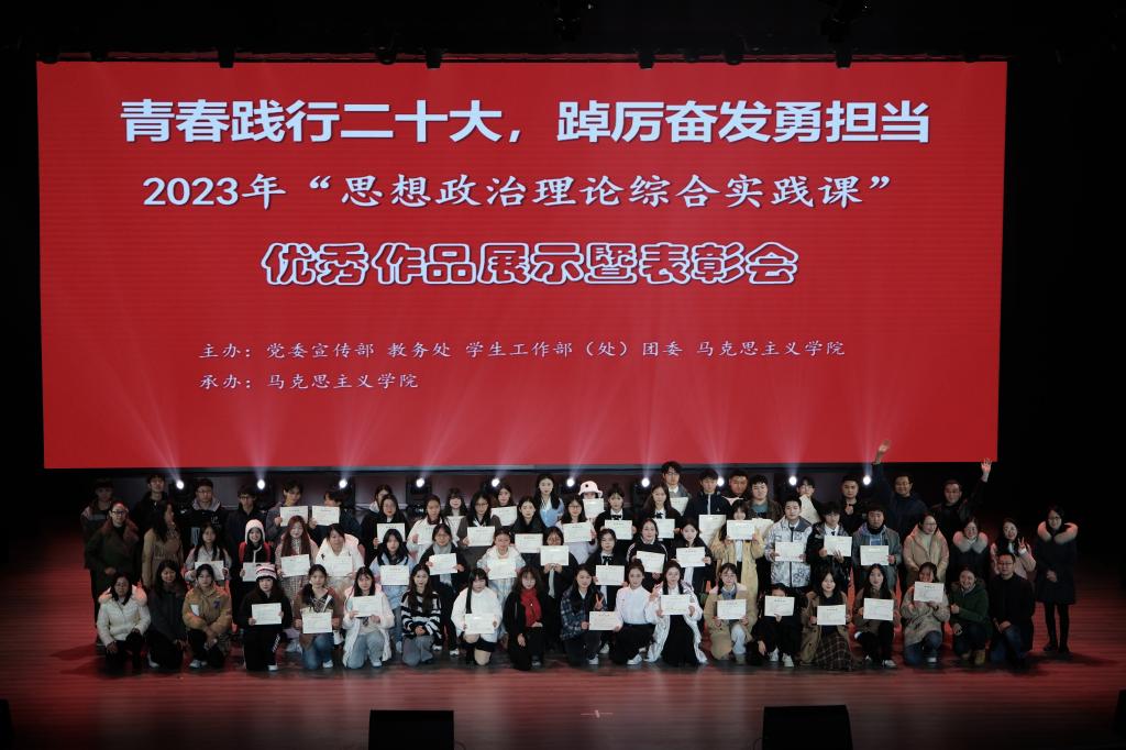 抚今追昔,大地礼赞,青春力量共筑中国梦,扬帆起航;穿越时空,圆梦高歌,新时代青年同心协力,气震山河。12月28日晚,由党委宣传部、教务处、学生工作部(处)、团委和马克思主义学院共同主办,马克思主义学院承办的2023年“思想政治理论综合实践课”优秀作品展示暨表彰会在图书馆报告厅举行。学校党委书记李廷勇及相关部门领导出席并为获奖作品颁奖。思政课专兼职教师、学生代表等500余人共同观看了这场精彩的“思政大课”。