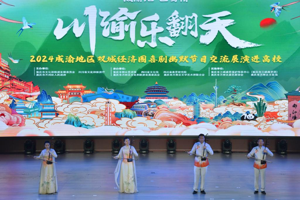 本次活动,川渝两地的艺术家们联袂呈现了一场形式多样、内容丰富的文化艺术盛宴。节目以四川清音、四川扬琴、曲艺小品、四川车灯、四川竹琴、二胡齐奏等多种形式呈现,精湛的艺术张力和深厚的文化内涵,赢得了在场师生的热烈掌声。尤其是四川清音《古蜀风流》将四川本土文化元素与曲艺表演巧妙结合,淋漓尽致地展现了古蜀文化的独特魅力。