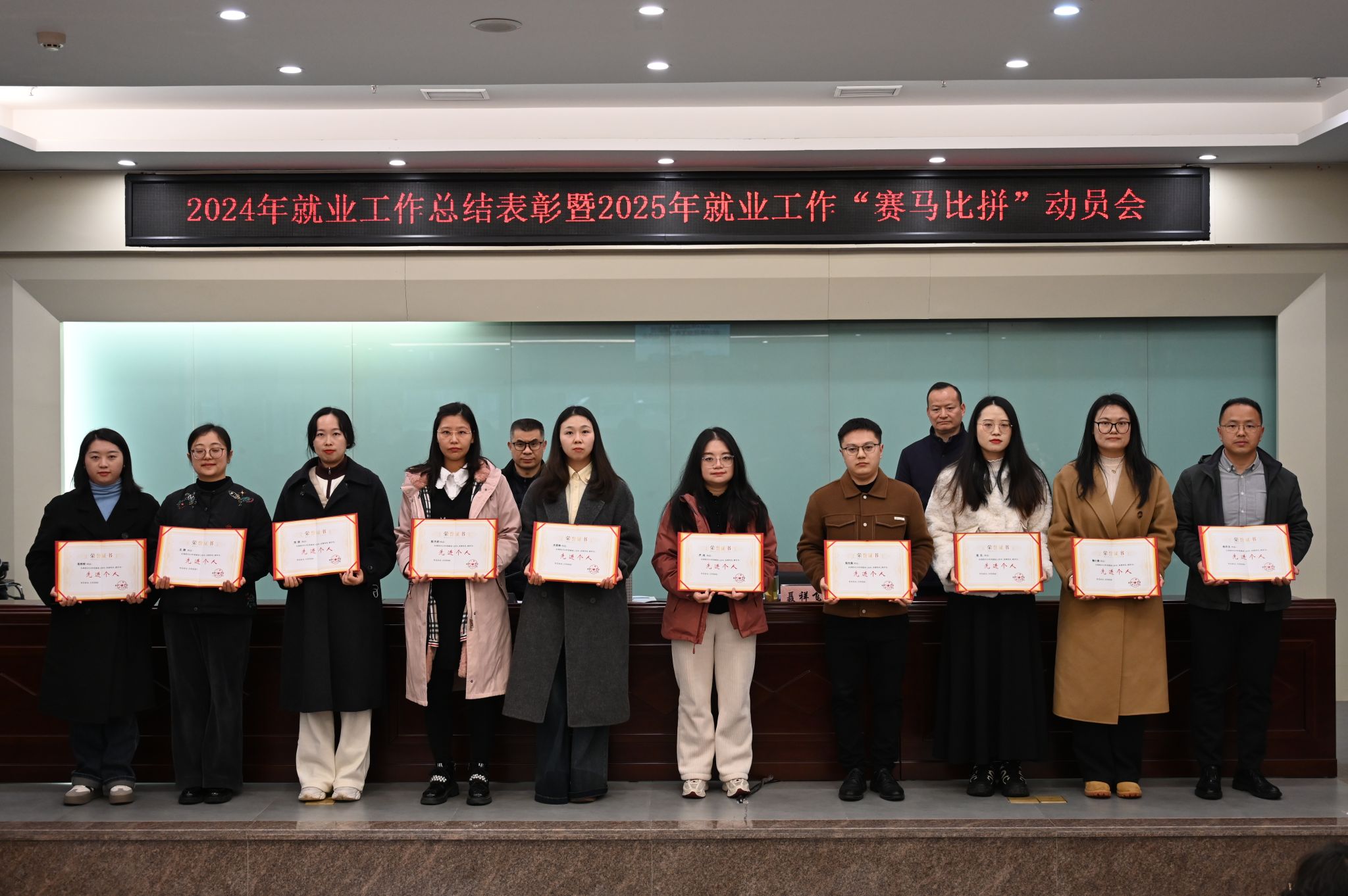会议对2024年就业工作中表现卓越的先进集体与先进个人予以表彰。工商管理学院副书记李中春、数学与统计学院就业专干张婷婷先后进行交流发言,分享宝贵经验与做法。招生就业处处长刘文菘全面总结2024年就业工作,部署2025年就业重点任务,并详细解读了就业工作“赛马比拼”实施方案。