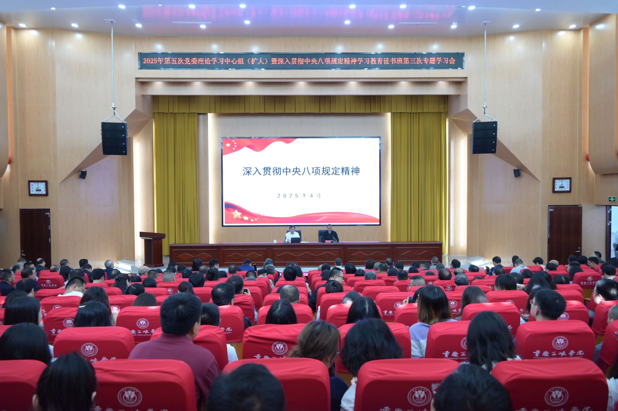4月25日,第五次党委理论学习中心组(扩大)学习暨深入贯彻中央八项规定精神学习教育读书班第三次专题学习会在博学楼多功能厅举行。会议特邀市委教育工委委员、市纪委监委驻市教委纪检监察组组长傅兵军作“深入贯彻中央八项规定精神”专题辅导。全体校领导,党委委员、纪委委员,副处级及以上干部,专职组织员,各二级党组织书记、纪检委员,各基层党支部书记、纪检委员,以及提级交叉巡察组临时党支部负责人参学。党委书记许光洪主持学习会。