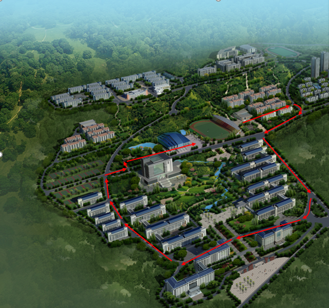 第一运动场(起点)——海棠苑1舍外公路——右转(下行)——银杏1路——右转(下行)——求索大道——左转(下行)——香樟1路——右转——明辨楼1栋——右转——篮球场——右转——求索大道——左转(上行)——游泳池——第一运动场东入口(终点)。