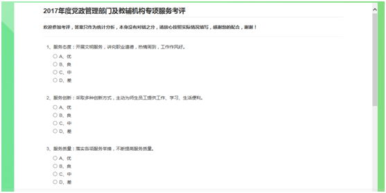 可返回首页“我的应用”或直接在此处点击“2017年度党政管理部门及群团组织、直属业务单位 ‘专项服务’考评”进入考评,如下图: