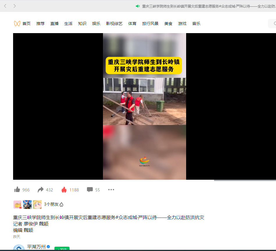 下一条:2023年7月5日《第1眼新闻》:7月5日,重庆万州,大学生奋战在一线,积极开展灾后重建志愿服务!#众志成城·严阵以待——全力以赴防洪抗灾 #重庆 #本地新闻