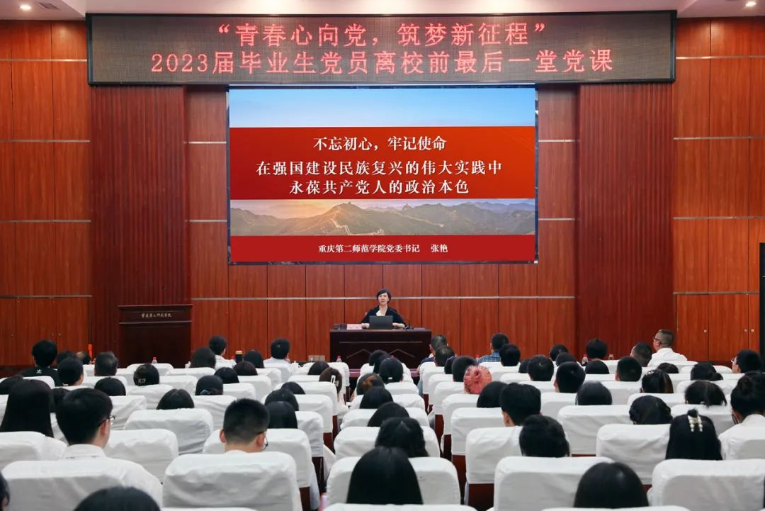 重庆第二师范学院党委书记张艳为2023届毕业生党员上党课为推动学习贯彻习近平新时代中国特色社会主义思想主题教育走深走实,引导和鼓励广大毕业生党员坚定理想信念,以饱满热情和昂扬斗志投身社会建设,6月25日,重庆第二师范学院开展2023届毕业生党员党性教育活动。学校党委书记张艳出席并为毕业生党员上党课,党委组织部、党委宣传部、党委学工部、校团委等相关职能部门和各二级学院200余名教师和毕业生党员代表参加活动。