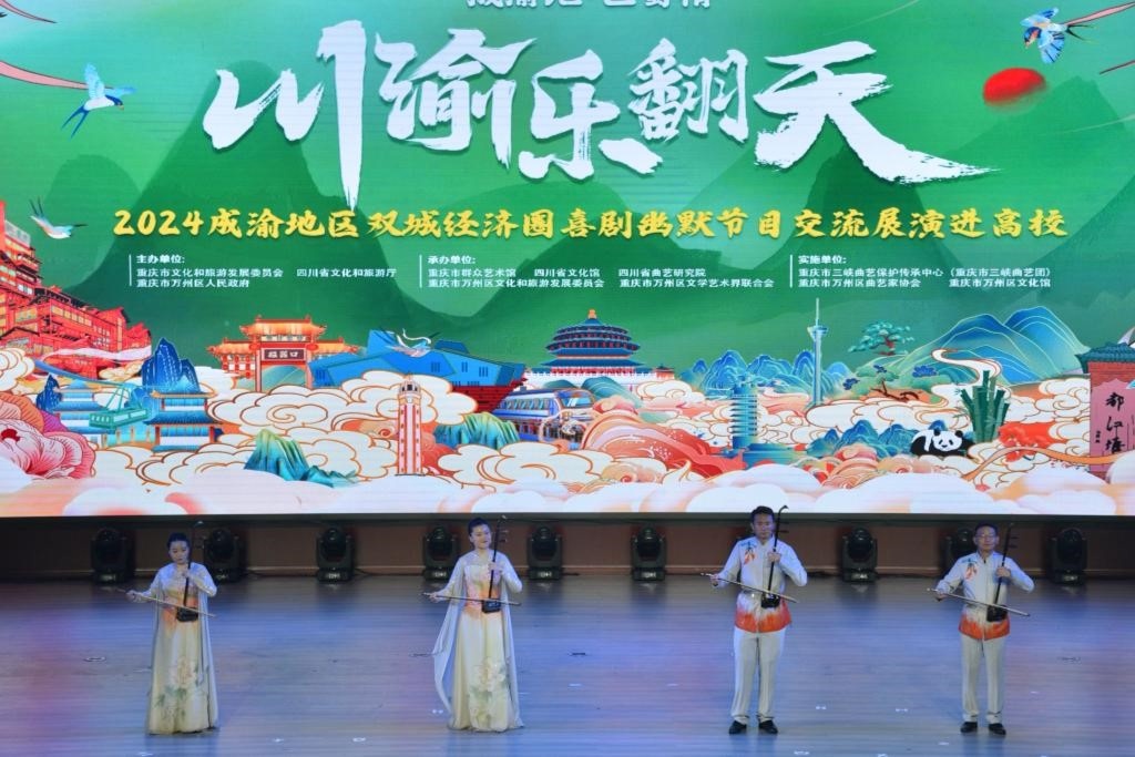 本次活动,川渝两地的艺术家们联袂呈现了一场形式多样、内容丰富的文化艺术交流展演活动。节目以四川清音、四川扬琴、曲艺小品、四川车灯、四川竹琴、二胡齐奏等多种形式呈现,精湛的艺术张力和深厚的文化内涵,赢得在场师生的热烈掌声。尤其是四川清音《古蜀风流》将四川本土文化元素与曲艺表演巧妙结合,淋漓尽致地展现了古蜀文化的独特魅力。