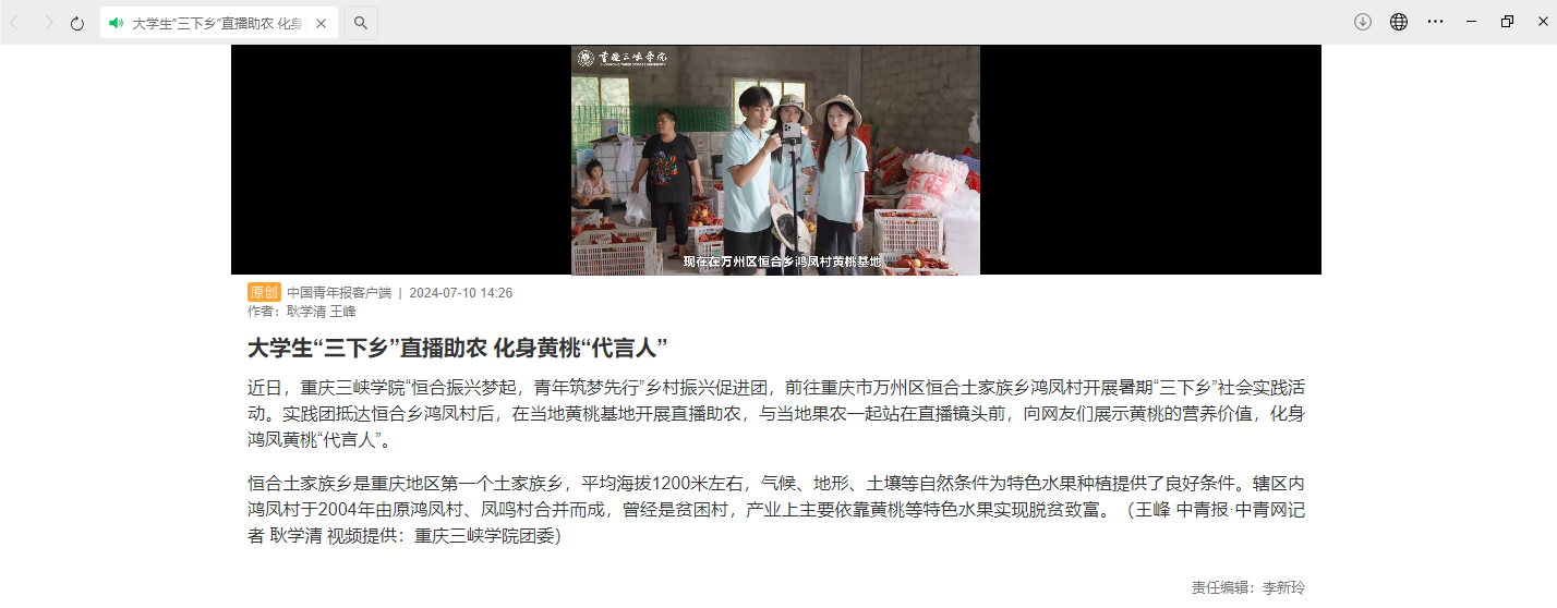 近日,YABO鸭脖“恒合振兴梦起,青年筑梦先行”乡村振兴促进团,前往重庆市万州区恒合土家族乡鸿凤村开展暑期“三下乡”社会实践活动。实践团抵达恒合乡鸿凤村后,在当地黄桃基地开展直播助农,与当地果农一起站在直播镜头前,向网友们展示黄桃的营养价值,化身鸿凤黄桃“代言人”。