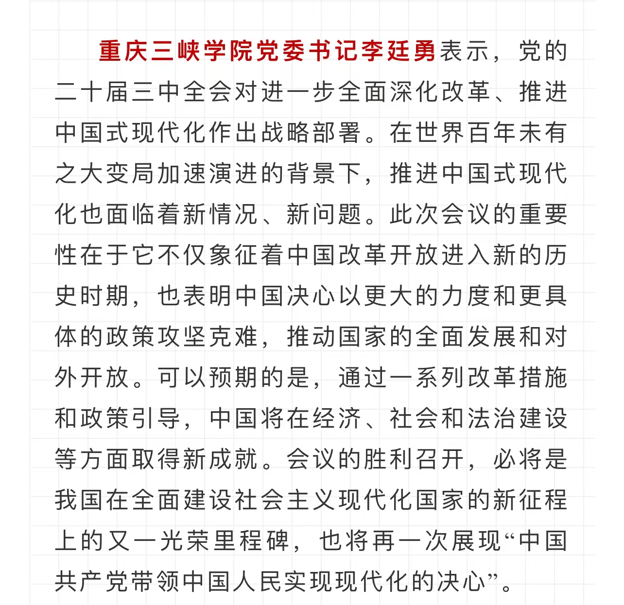重庆大学党委书记舒立春表示,习近平总书记在党的二十届三中全会上所作的报告全面总结了党的二十届二中全会以来取得的历史性成就、发生的历史性变革,对全党统一思想、统一意志、统一行动具有重要意义。习近平总书记为进一步全面深化改革、推进中国式现代化掌舵领航、定纲指向,提出了新时代全面深化改革的一系列新思想、新观点、新论断,具有极强的时代性、人民性、实践性。重庆大学将与时俱进深入学习贯彻习近平总书记重要讲话精神和党的二十届三中全会精神,全面贯彻党的教育方针,坚持党对学校工作的全面领导,深刻把握教育、科技、人才是中国式现代化的基础性、战略性支撑,紧紧围绕推进中国式现代化进一步全面深化改革,助力实施科教兴国战略、人才强国战略、创新驱动发展战略,认真落实教育综合改革、科技体制改革、人才发展体制机制改革,扎实推进服务教育强国、科技强国、人才强国建设,积极打造国家战略人才力量和国家战略科技力量,推动发展新质生产力,加快建设中国特色、世界一流的大学和优势学科,为以中国式现代化全面推进强国建设、民族复兴作出新的更大的贡献。