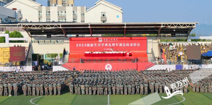 在庄严的国歌声中,5000余名2024级新生身着迷彩服,整齐列队,庄严肃穆,表达他们对祖国的美好祝愿;在激昂的军乐声中,他们分方队,迈着铿锵有力的步伐,昂首阔步地经过主席台,接受检阅。擒敌拳、匕首操……绿茵场上,他们英姿飒爽,意气风发,为自己15天的军训生活交上满意答卷,向即将开启的大学时光扬帆起航。