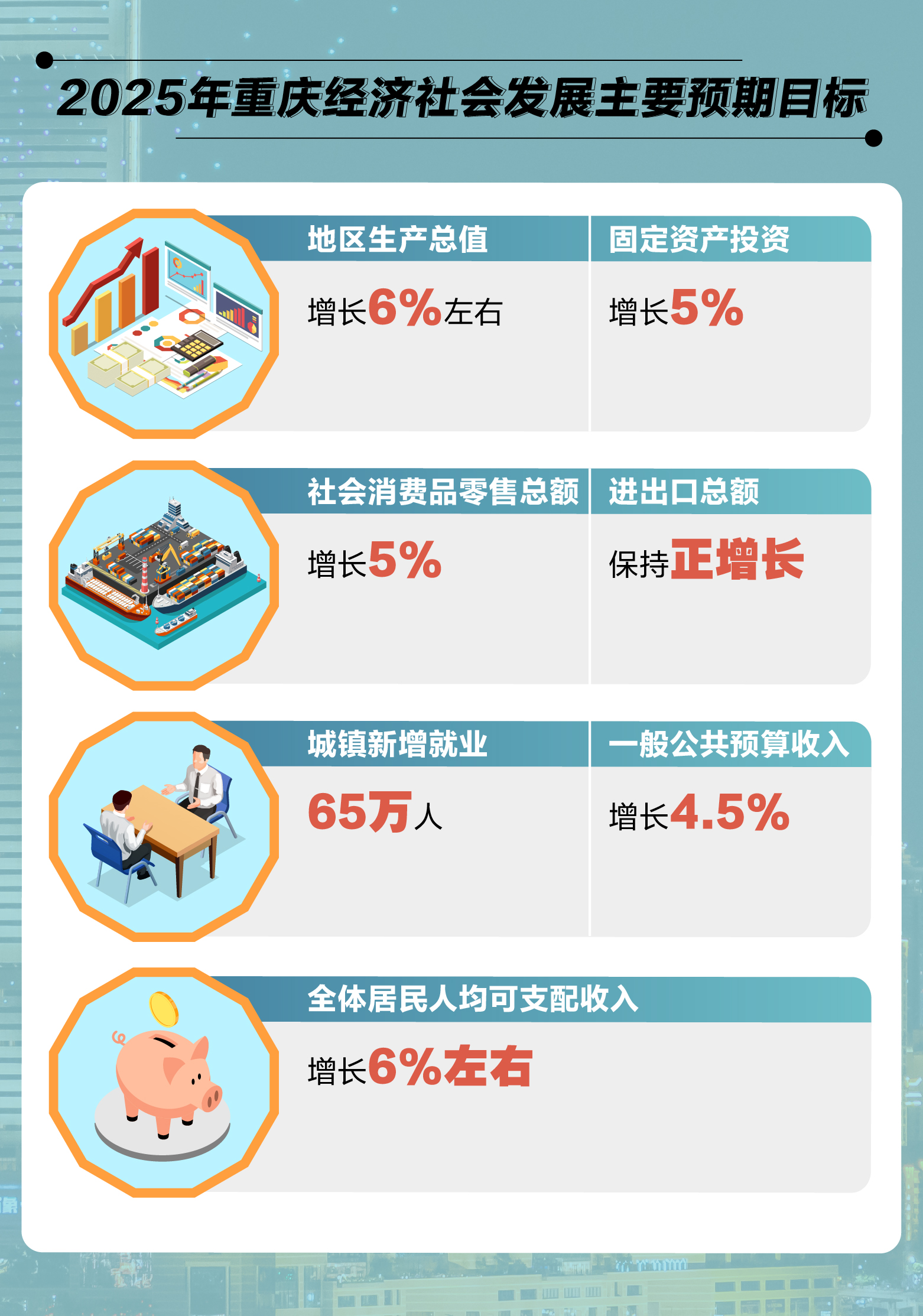 在今年的重庆政府工作报告中,2025年,重庆经济社会发展的主要预期目标是“地区生产总值增长6%左右,固定资产投资增长5%,社会消费品零售总额增长5%”。