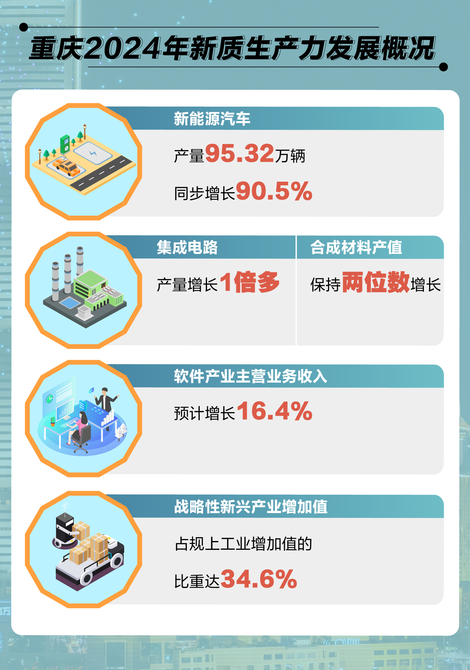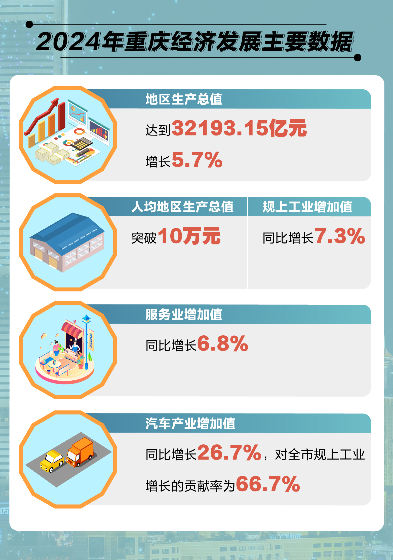 去年,重庆的经济发展增速令全国瞩目:2024年,重庆全年地区生产总值达到32193.15亿元、增长5.7%,仅次于上海、北京、深圳,超过广州,位居全国第四位。同时,重庆人均地区生产总值突破10万元。