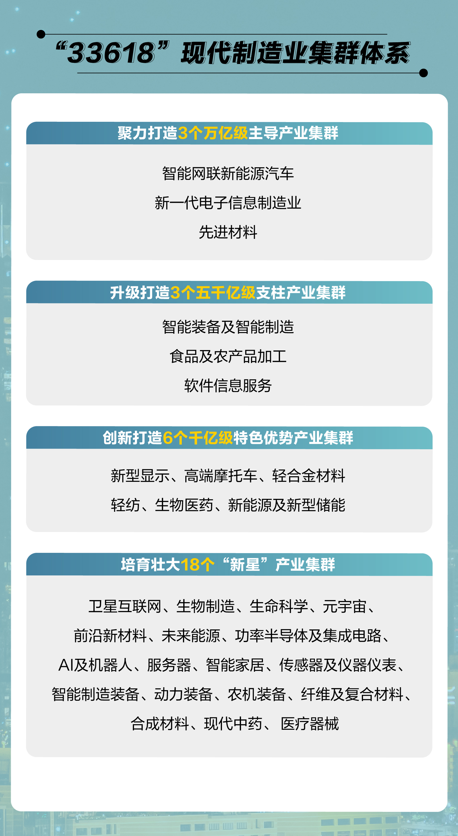细分来看,今年,重庆将协同推进320个川渝共建重点项目,实施“2小时重庆”交通圈补短板工程;新实施1500个工业技改项目,带动工业投资增长10%;做大做强“33618”现代制造业集群;打造国家物流枢纽经济区,力争枢纽通道联运量增长20%……