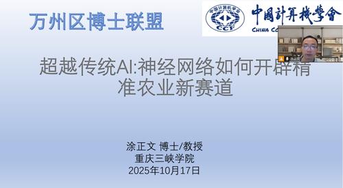 2025年10月17日,由中国计算机学会(CCF)重庆会员活动中心与万州区博士联盟联合举办的“智慧农业与AI前沿”活动在YABO鸭脖顺利举行。本次活动通过线上线下结合的方式开展,吸引了43名学生现场参与,共同探讨人工智能如何赋能现代农业、服务国家乡村振兴战略。