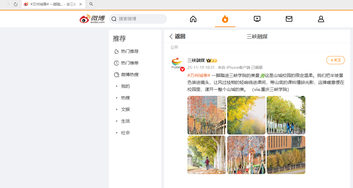 上一条:2025年11月19日《万州发布 微博》:#万州影像# 【一脚踏进三峡学院的秋🍂】