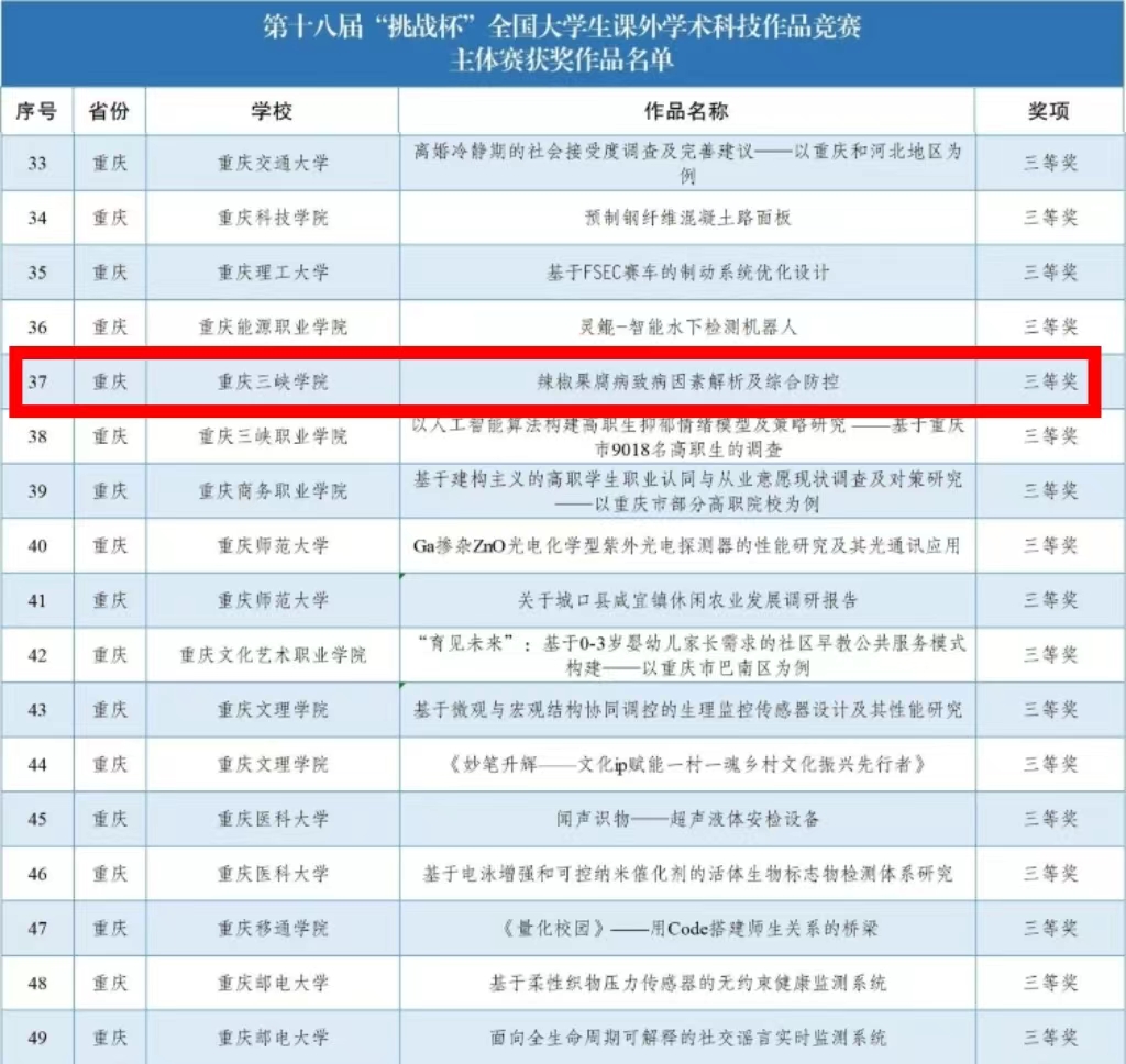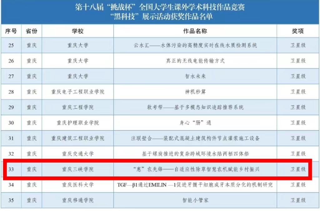 近日,第十八届“挑战杯”全国大学生课外学术科技作品竞赛决赛结果揭晓。由我校青年教师芮璐指导,生物与食品工程学院2020级农学徐嘉茂等同学参与的项目《辣椒果腐病致病因素解析及综合防控》获主体赛三等奖;由青年教师罗强、吴小霞指导,机械工程学院2021级机械设计制造及其自动化专业韩彬等同学参与的项目《“惠”农先锋——自适应性除草智慧农机赋能乡村振兴》在“黑科技”展示活动获“卫星级”。