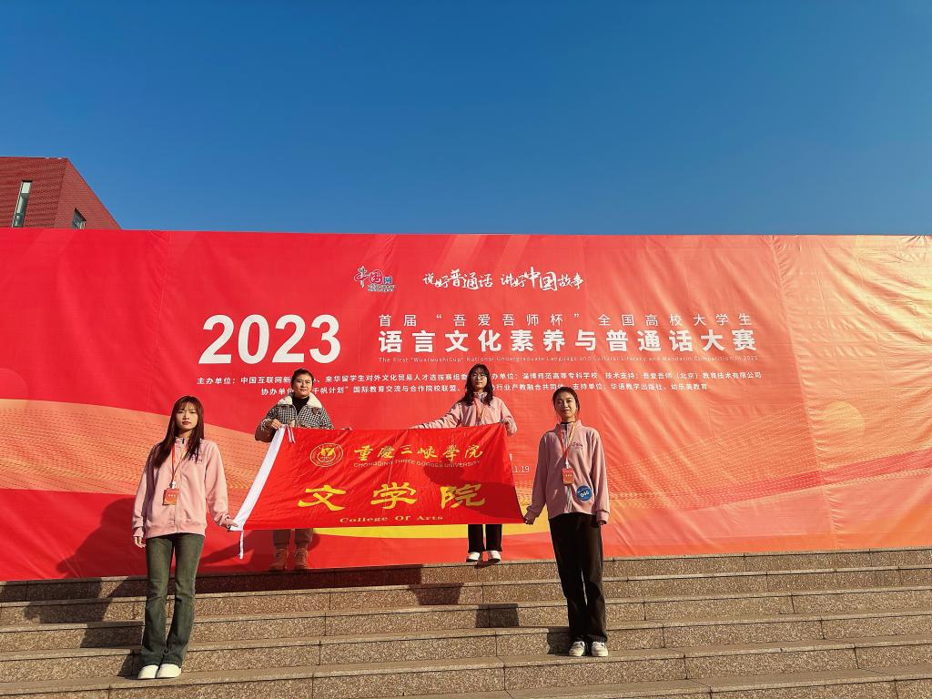 近日,2023年首届“吾爱吾师杯”全国高校大学生语言文化素养与普通话大赛决赛在山东举行。由我校文学院学生马瑞瑞、王馨婕、谭清云组成的团队获全国本科组团体二等奖。