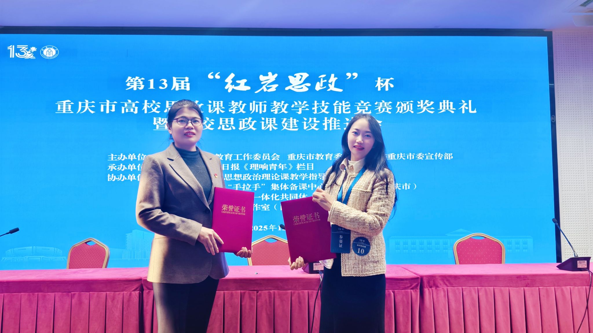 11月20日至21日,第13届“红岩思政”杯重庆市高校思政课教师教学技能竞赛决赛圆满落幕。经过校级选拔、市级课程组复赛、决赛等环节激烈比拼,我校马克思主义学院推选的五位教师全部获奖。其中,黄冬梅、李爱梅两位老师入围决赛,荣获二等奖;王迪、阎茂瑶、郭庆玲三位老师凭借在课程组复赛中的良好表现,荣获三等奖。