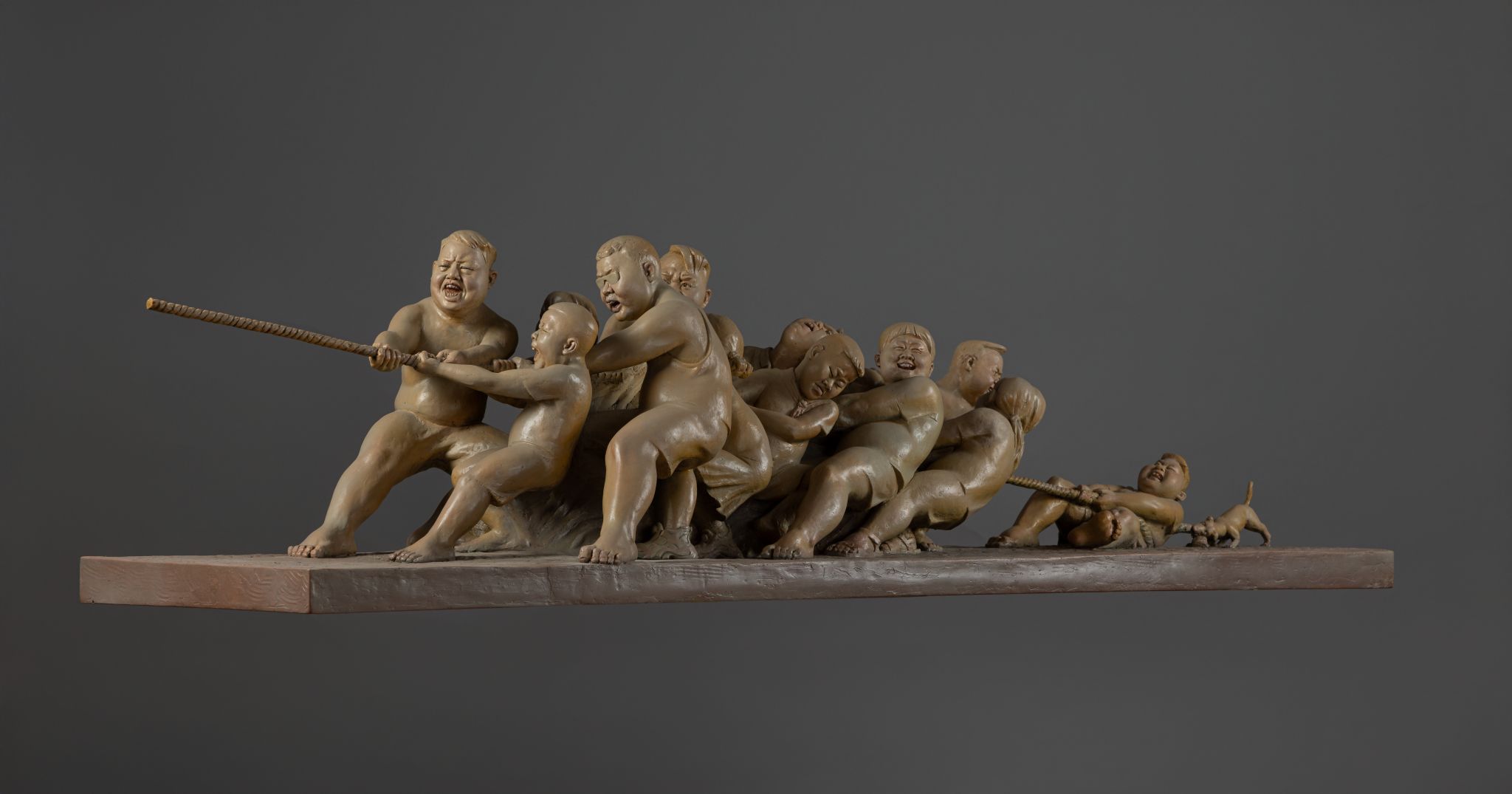 作品说明:作品以具象写实的雕塑语言,聚焦于三峡库区乡村坝子上一场充满欢声笑语的趣味拔河比赛。作品通过孩童与大人协同发力、开怀欢笑的瞬间,捕捉了蓬勃的生命力与浓郁的乡土情怀。人物神态鲜活、动作张力十足,脚下粗砺的坝石地面强化了乡土气息。紧绷的绳索与动态构图烘托出沸腾的现场感,既展现了三峡人民质朴乐观的生命力,亦折射出乡村振兴背景下民生安乐、邻里和睦的美好生活图景。